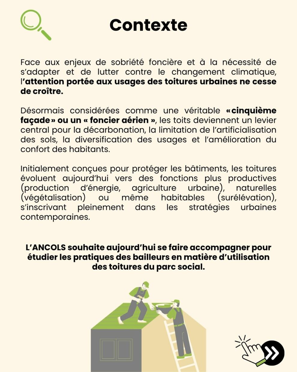 L’ANCOLS souhaite aujourd’hui se faire accompagner pour étudier les pratiques des bailleurs en matière d’utilisation des toitures du parc social.